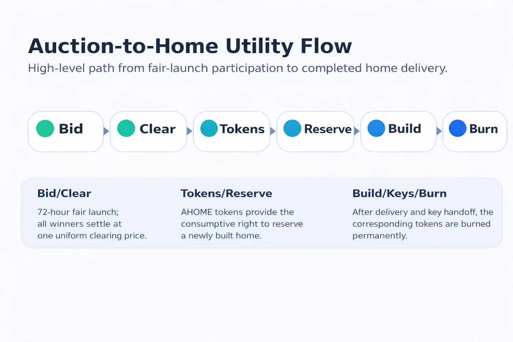 Upon completion of construction, the home will be transferred through standard off-chain real estate closing procedures, including title transfer, deed recording, and required tax documentation. At that time, the corresponding AHOME tokens used for the reservation will be permanently removed from circulation.