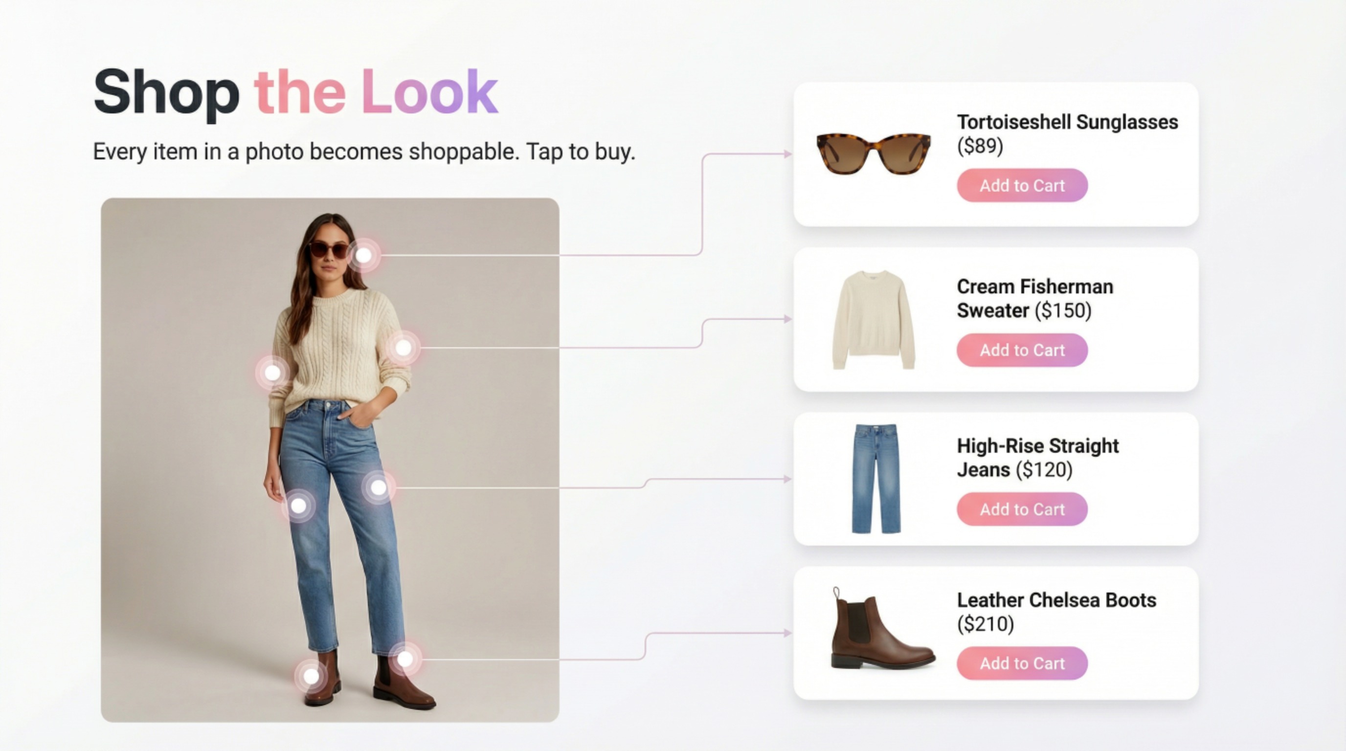 Shop the Look transforms editorial and social imagery into shoppable content. AI detects every item in a photo and maps it to catalog SKUs automatically, turning a brand’s Instagram presence into a direct revenue channel in seconds. For content teams, the workflow is: find a trending look on Instagram or Pinterest, share it to Youzu, and the AI automatically identifies every item — clothing, accessories, furniture, decor — maps each one to a catalog SKU, and publishes the whole image as a shoppable piece with product cards in seconds. The same capability that turns a fashion editorial into a revenue channel also turns a styled room photo into a furniture shopping journey. From trend to revenue in seconds, regardless of vertical.